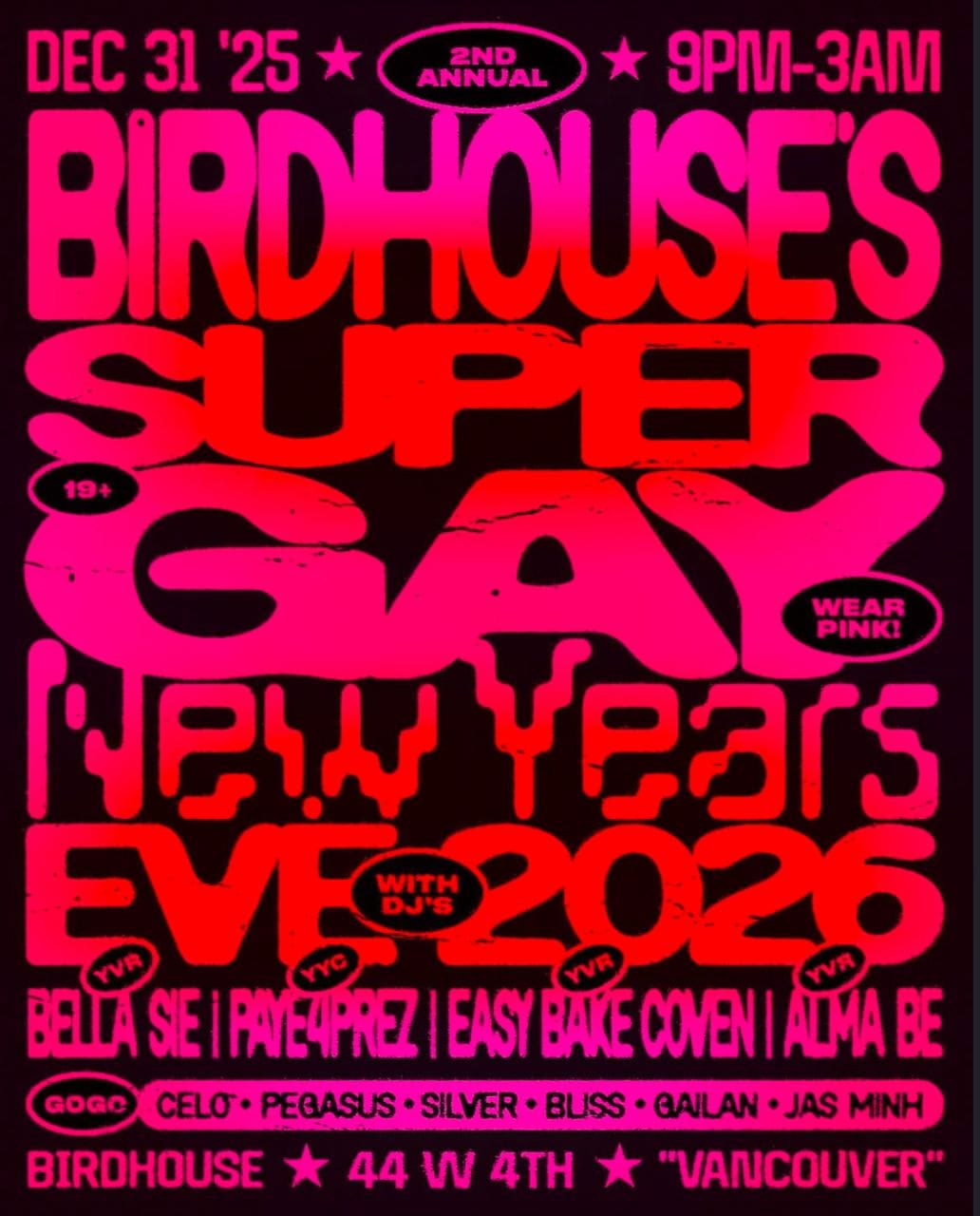 Birdhouse's Super Gay NYE 2026 - Birdhouse, 44 W 4th • December 31 - 9:00 PM - 3:00 AM - Vancouver - Limited Tickets at Door - Learn More